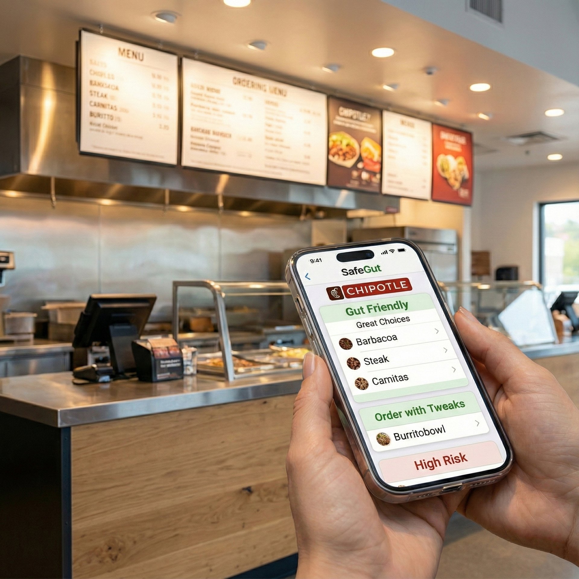 Menus are vague. Asking for swaps is awkward. And missing a hidden trigger like garlic or onion can mean hours of painful bloating later.